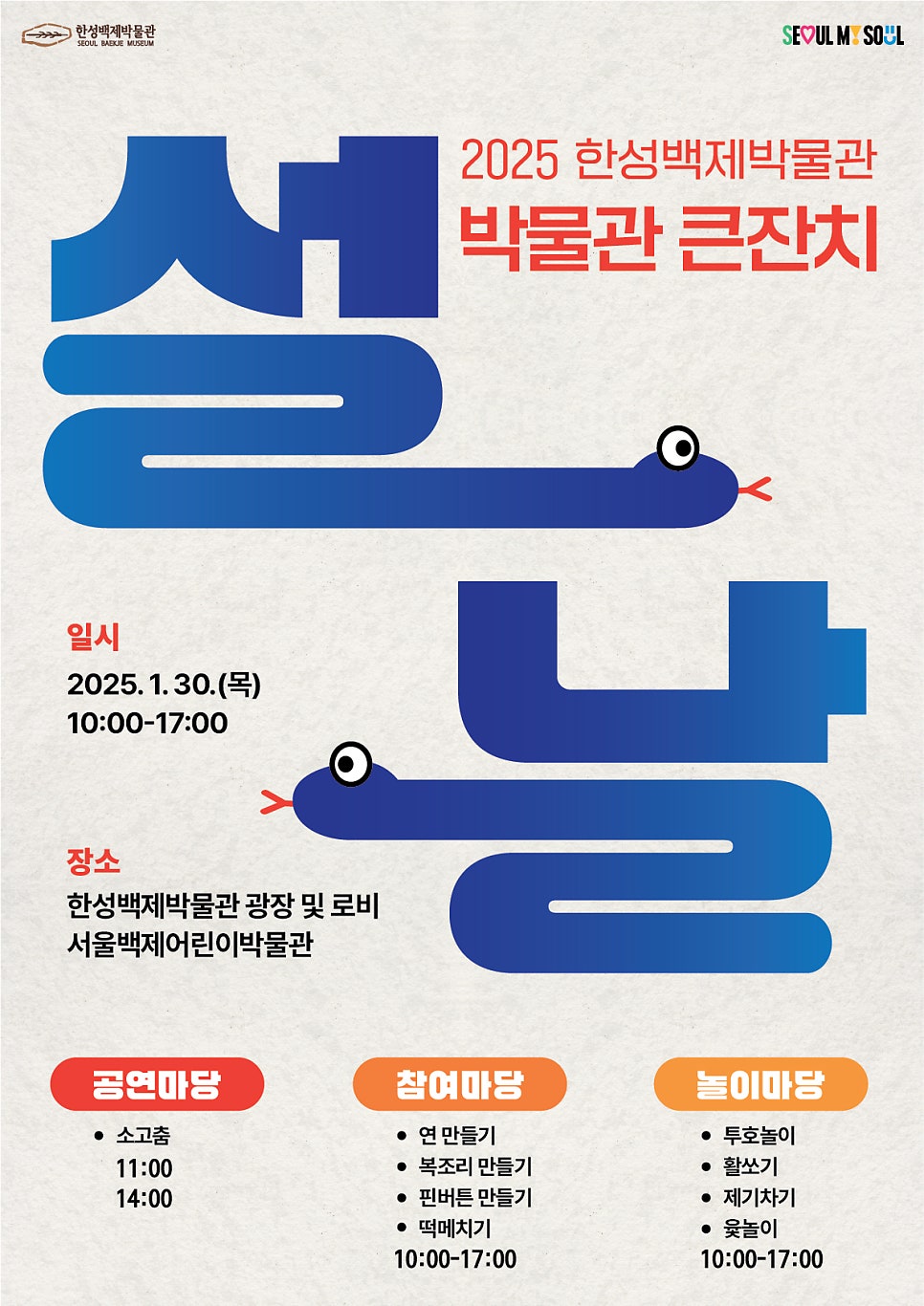 - 프로그램: 공예 체험(푸른 뱀 키링, 새해 토퍼, 가오리 연 만들기), 전통 놀이(널뛰기, 뿅망치 게임)